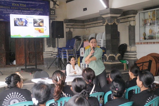The event was officially opened by the Chairperson of the Banjar Purnama Asri PKK, Ni Nyoman Sariani, who expressed her appreciation for the contribution of Udayana University lecturers and students in providing educational activities for the community. According to her, the material presented is highly relevant for housewives, who play a crucial role in managing food within the family environment.